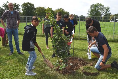 | Nach der Begrüßungsrede des Schulleiters Thorsten Kriegel stellen sich die Paten aus den zehnten Klassen vor. | Die Paten helfen auch, zusammen mit den neuen Schüler*innen den Jahrgangsbaum zu pflanzen. |