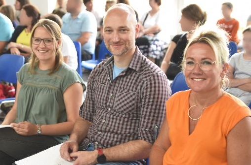 | Das neue Klassenleitungsteam für den Jahrgang 5 (v.l.): Frau Kühn, Herr Droldner und Frau Bündge | Die Schüler*innen der sechsten Klassen warten aufgeregt auf die Übergabe der Namensschilder. |