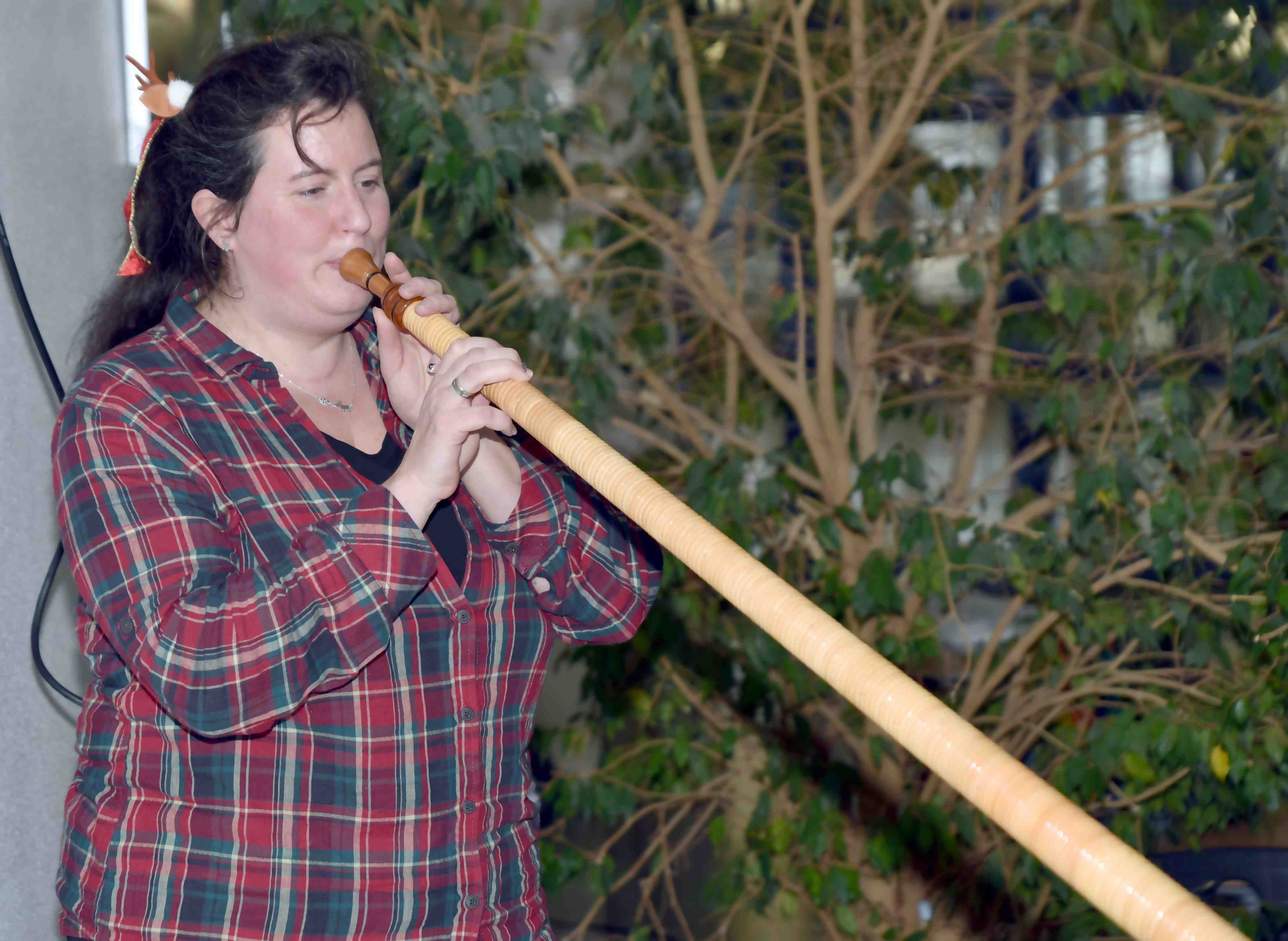Die Weihnachtsfeier begann mit einem rund vier Meter langen Blasinstrument, einer Alphorn-Einlage von Frau Rehwald. |