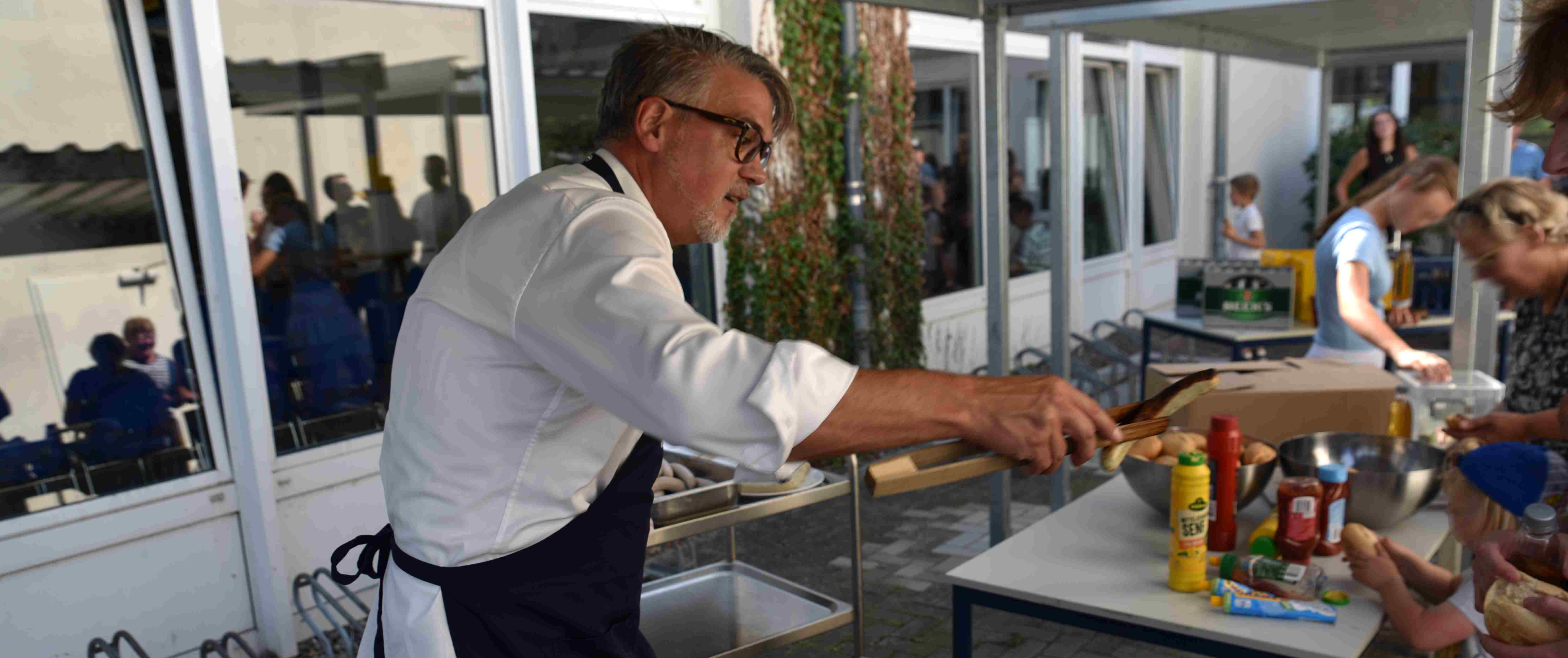 Während die Schüler*innen an ihrer ersten Unterrichtsstunde teilnahmen, gab es gegrillte Würstchen und Getränke vom Chef persönlich. |