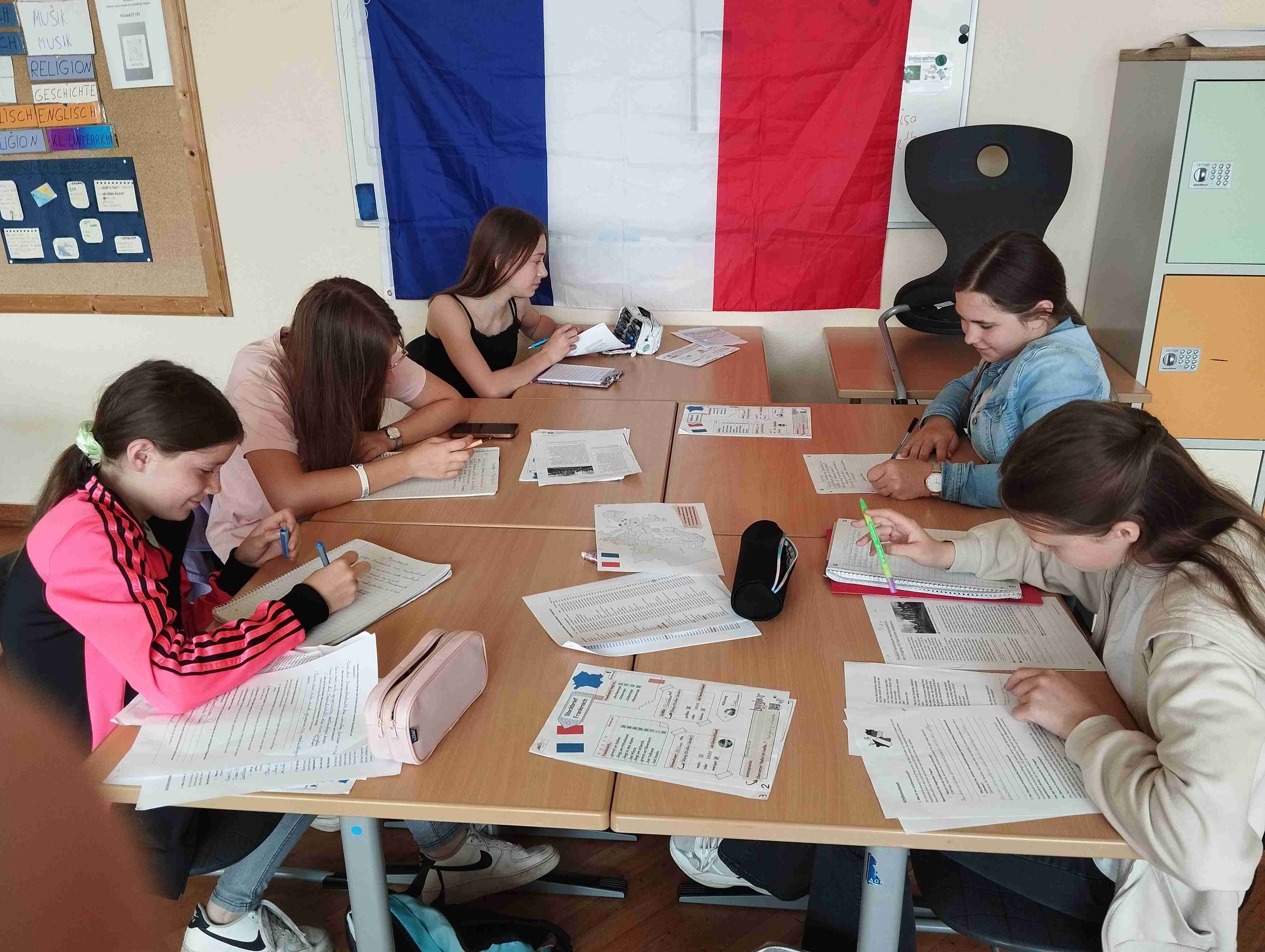 Projekt "Froschschenkel vs. Schweinshaxe": Hier wurde die deutsch-französische Freundschaft unter die Lupe genommen. Die Schüler*innen erarbeiteten geschichtliche und kulturelle Inhalte und hielten ihr neues Wissen in einem Podcast fest. (Foto: Arbeitsphase). |
