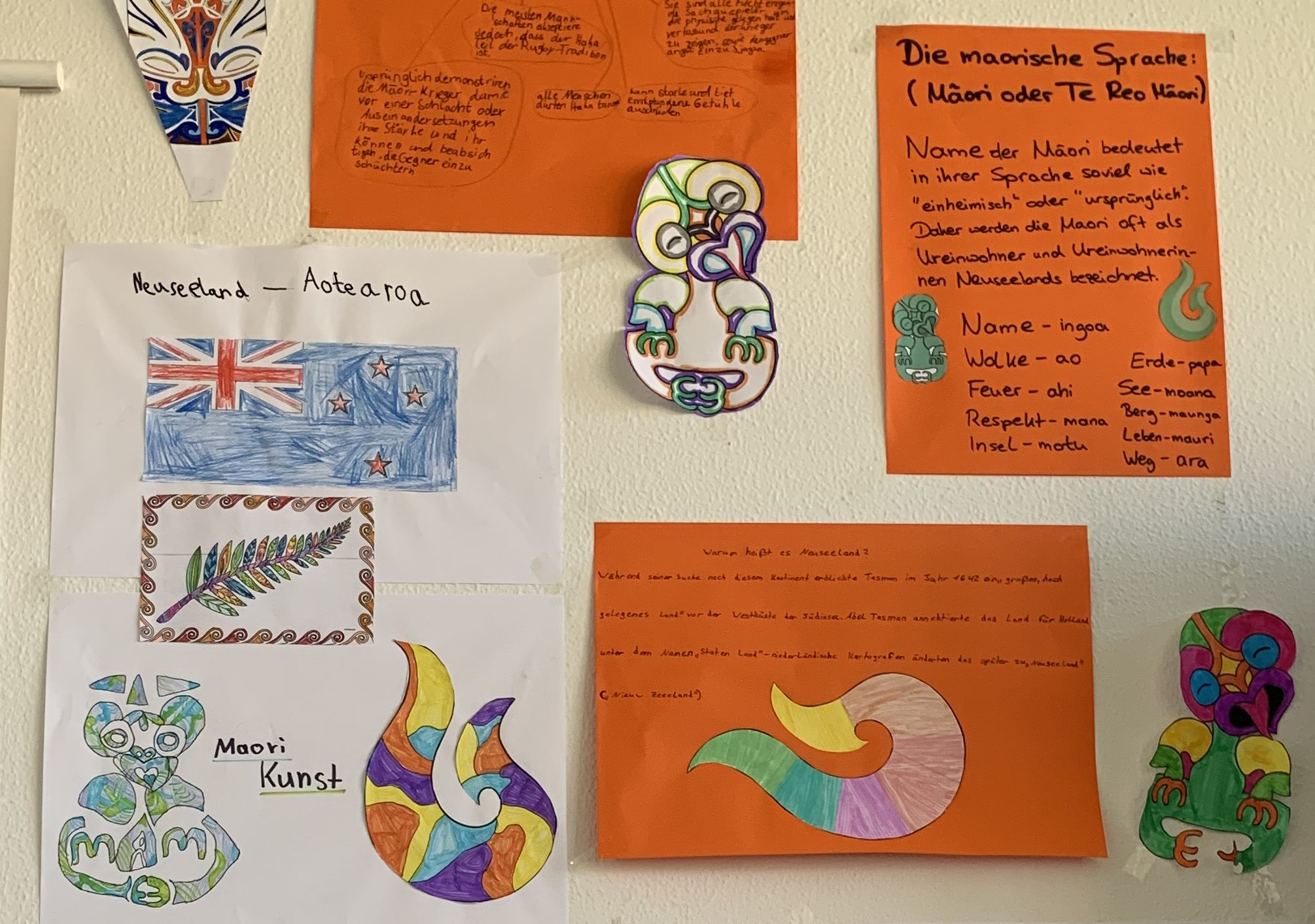 Projekt "Künste anderer Länder": Die Kinder entdeckten die faszinierenden Kunsttraditionen indigener Völker aus Australien, Neuseeland und Kanada. Sie wählten einen Kunststil aus, erforschten seine kulturelle Bedeutung, erforschten die Geschichte und Symbole der Kulturen, ließen sich davon inspirieren und gestalteten ihr eigenes Kunstwerk (l. Schildkröte mit DOT-painting Kunst der Aborigines, r. Neuseeland: Maori-Künste). |
